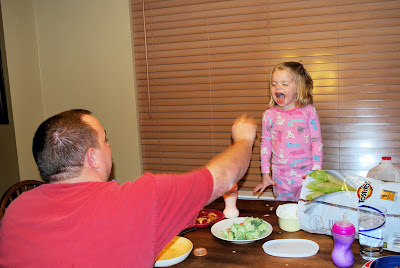 And finally, Chuck showed Gracie the "open your mouth and let me see if I can make it" game, so of course, that's all she wants to do at the dinner table now. I know, that's probably not the best manners to be teaching, but it keeps her at the table for a while and they have fun!